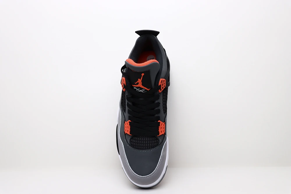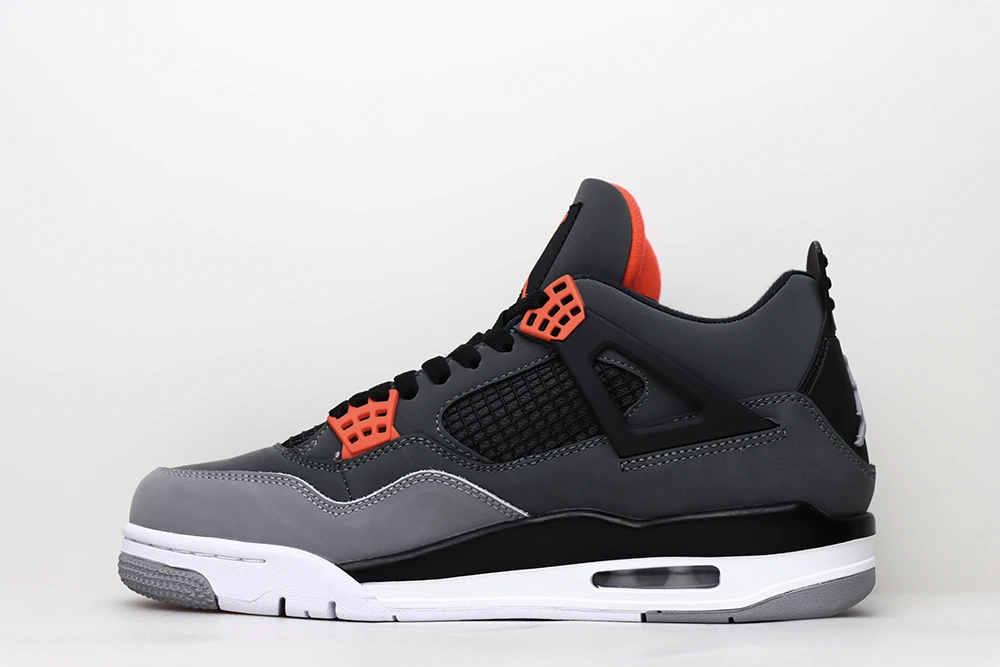 • The Air Jordan 4 Infrared features a tonal grey Durabuck upper with black TPU mesh inserts, tech straps, and heel tabs. Hits of Infrared on the lacing system and woven Jordan Flight tongue label add a sharp contrast to the neutral-toned base. From there, a white sole with visible Air units completes the design.